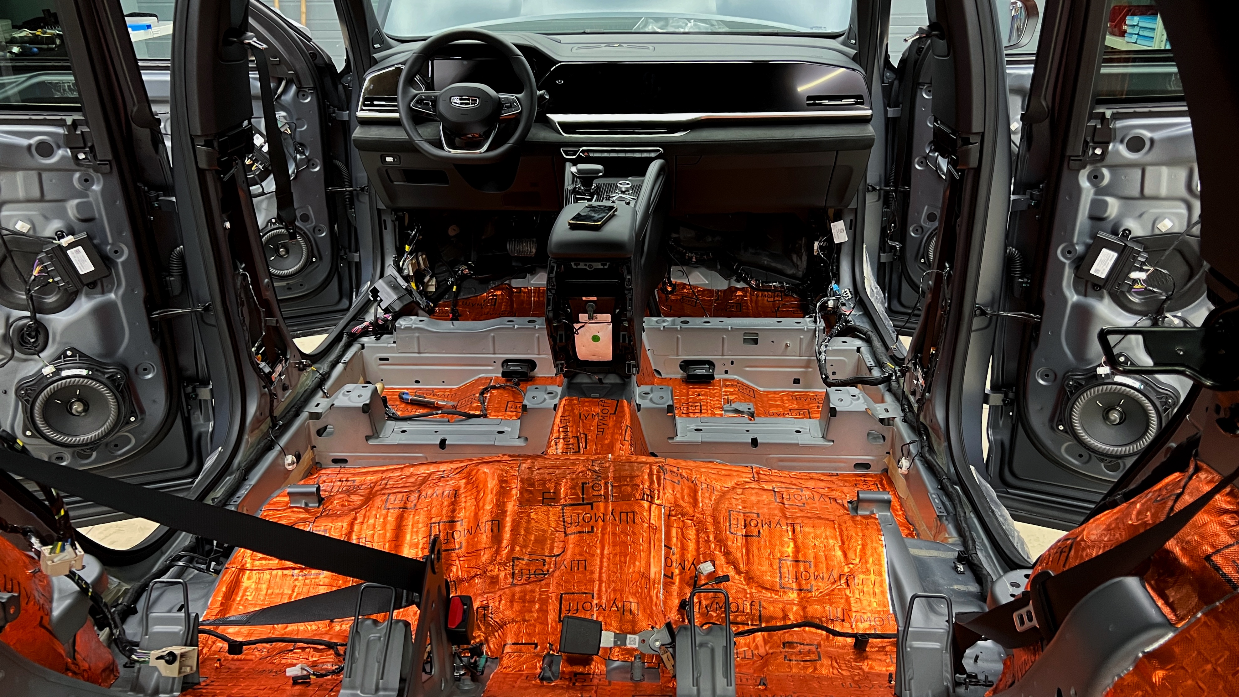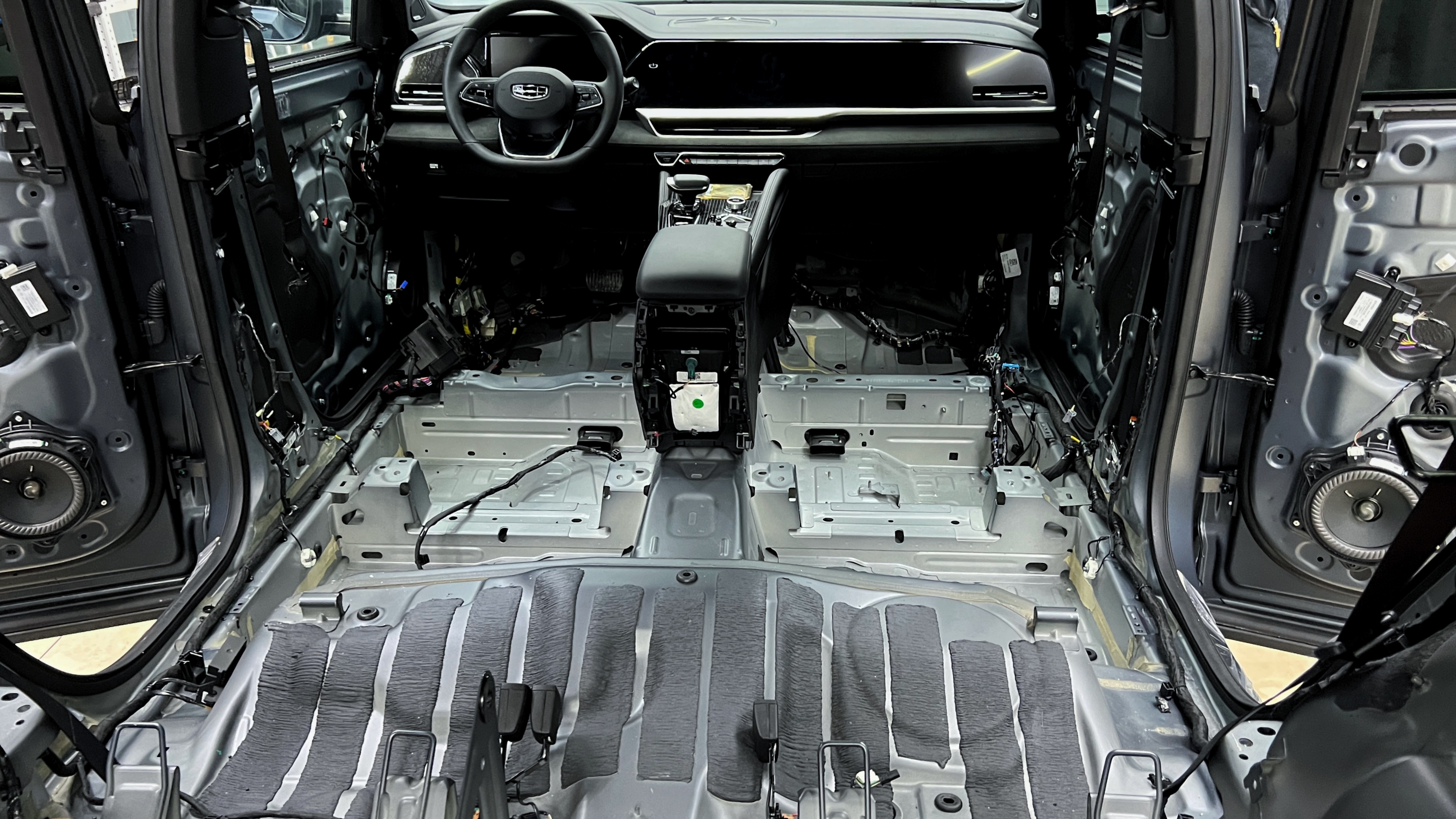 Штатная шумоизоляция Джили Монжаро Перед началом шумоизоляции пола на Geely Monjaro (Джили Монжаро) необходимо проверить качество адгезии заводской виброизоляции к кузову. Она должна хорошо держаться, в противном, случае её необходимо демонтировать.
