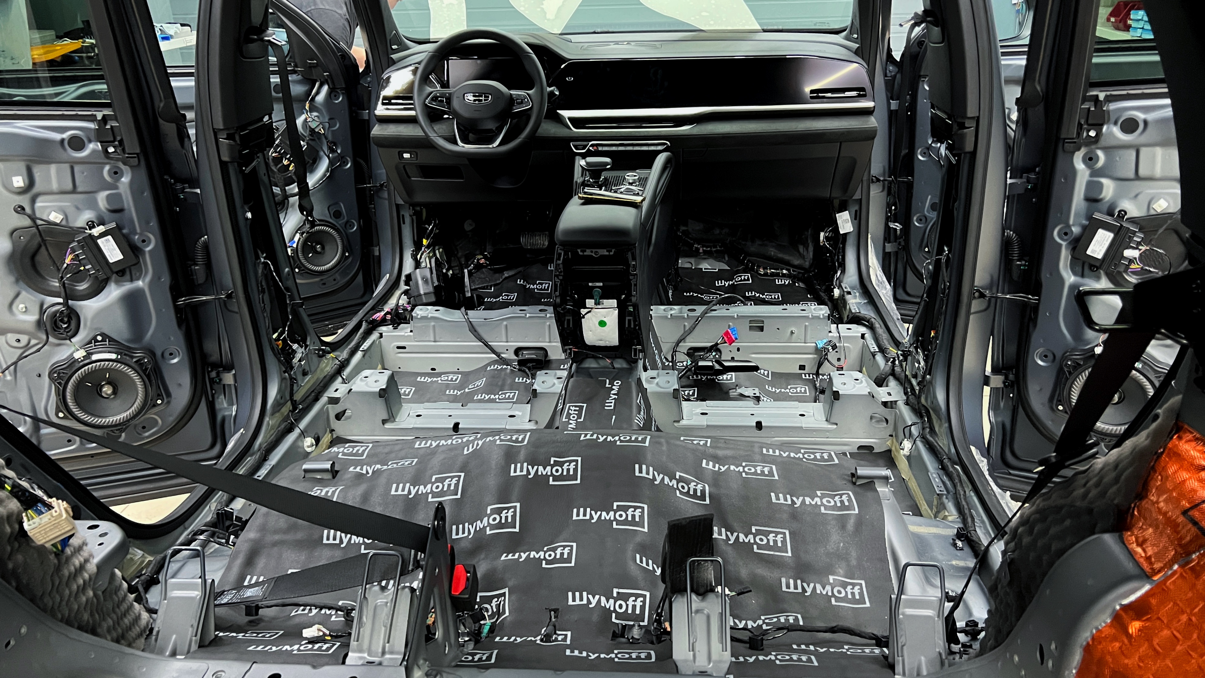 Шумоизоляция пола Джили Монжаро Вторым слоем поверх M4 клеим шумопоглотитель с черным влагозащитным покрытием Шумофф Герметон 7Л.