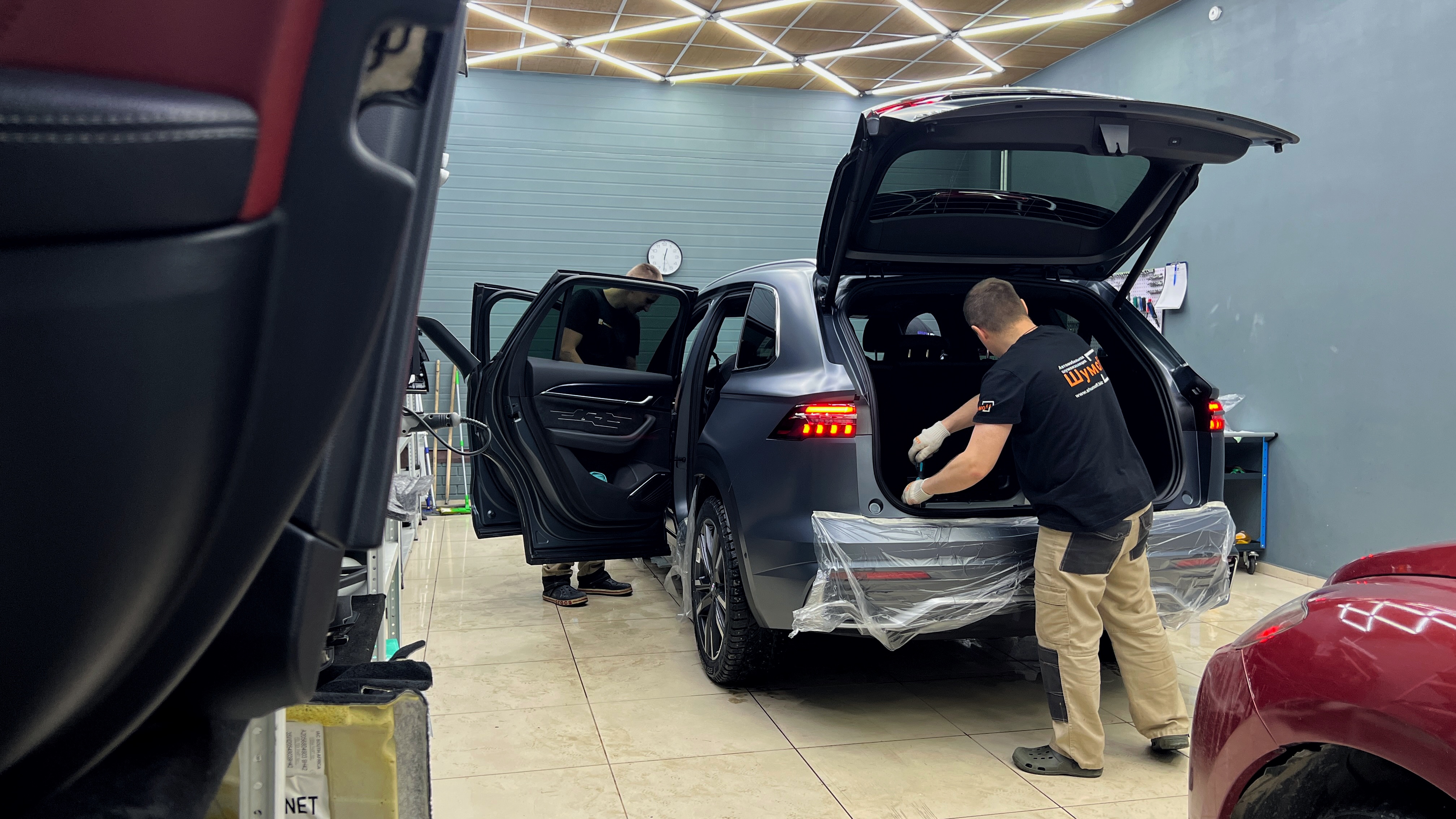 Вибро и шумоизоляция пятой двери  Джили Монжаро Для пятой двери используем легкую виброизоляцию Шумофф L2.