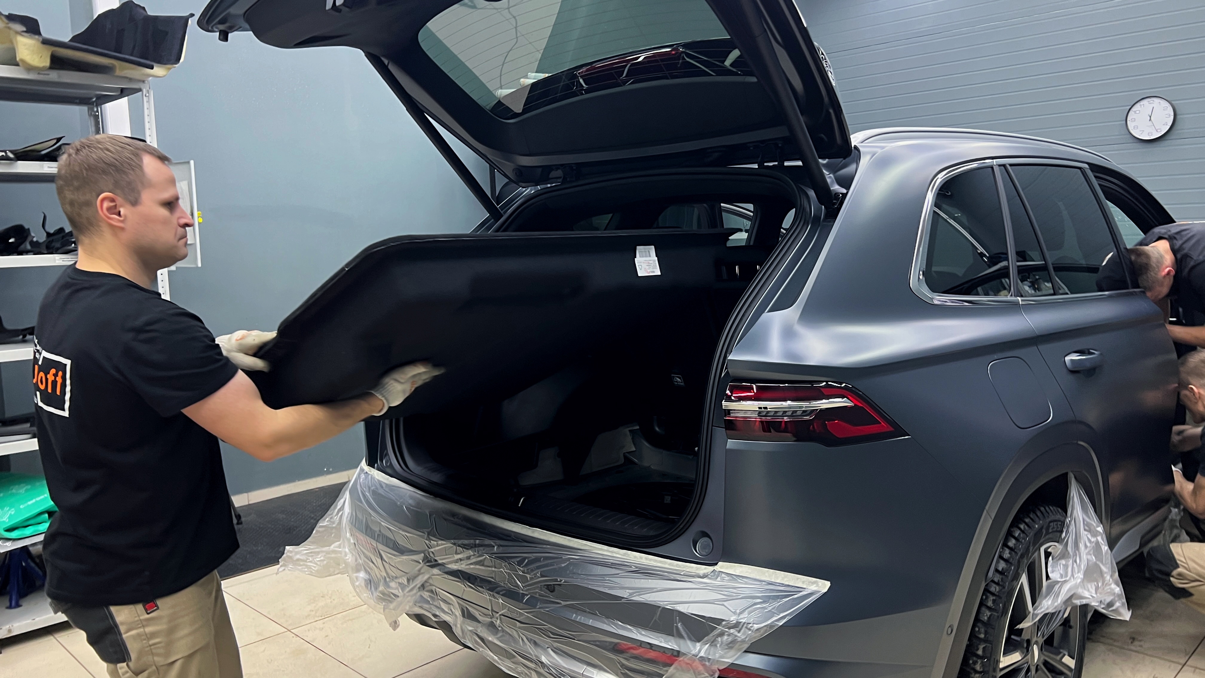 Обезжириваем поверхность и приступаем к монтажу второго слоя. Также для получения более эффективного результата используем компоновку из двух материалов На дно багажника клеим Шумофф Base 4. Этот слой позволит снизить нам шум от дороги.