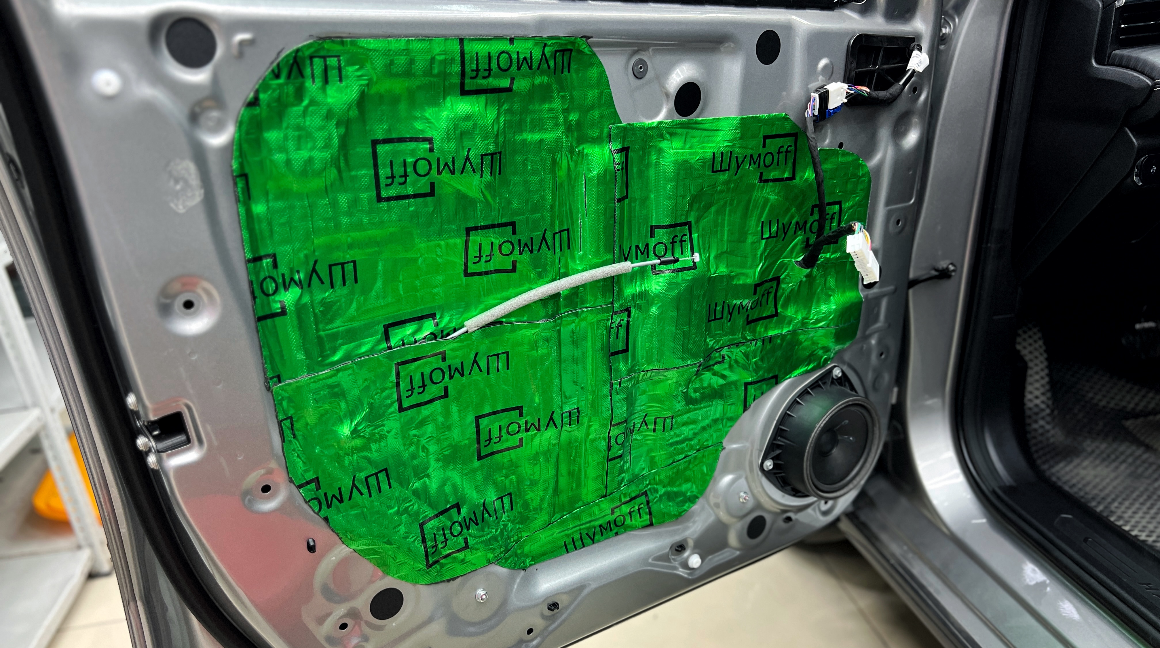 Приступаем к нанесению второго слоя. Вторым слоем на виброизоляцию монтируем мощный шумопоглотитель Шумофф Absorber A15