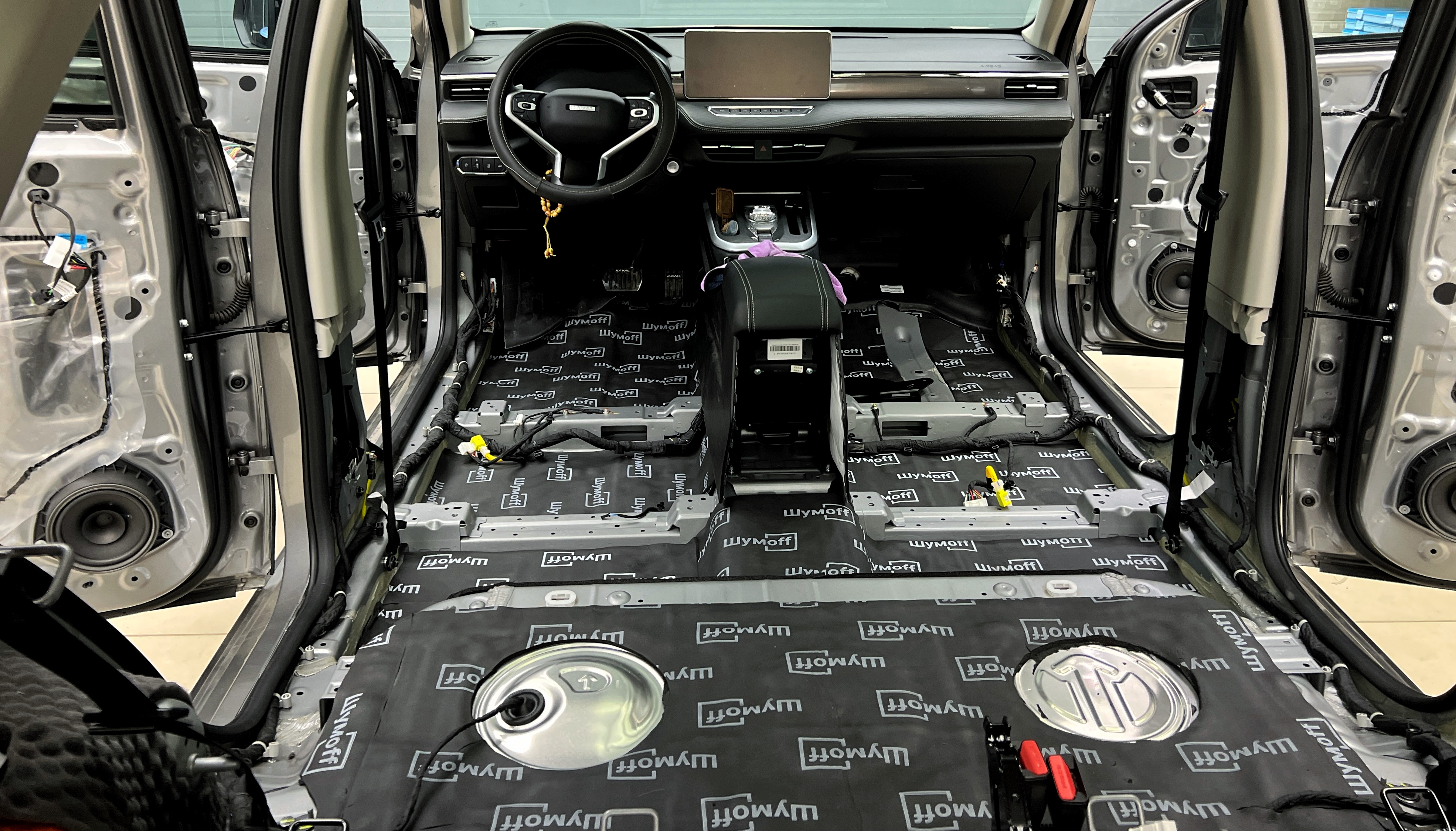 Переходим к оклейке самого корпуса панели, первым слоем частично наносим виброизоляцию Шумофф Joker, создавая тем самым идеальный баланс. Такая частичная оклейка позволит нам чрезмерно не утяжелять панель и придать ей необходимую сбитость