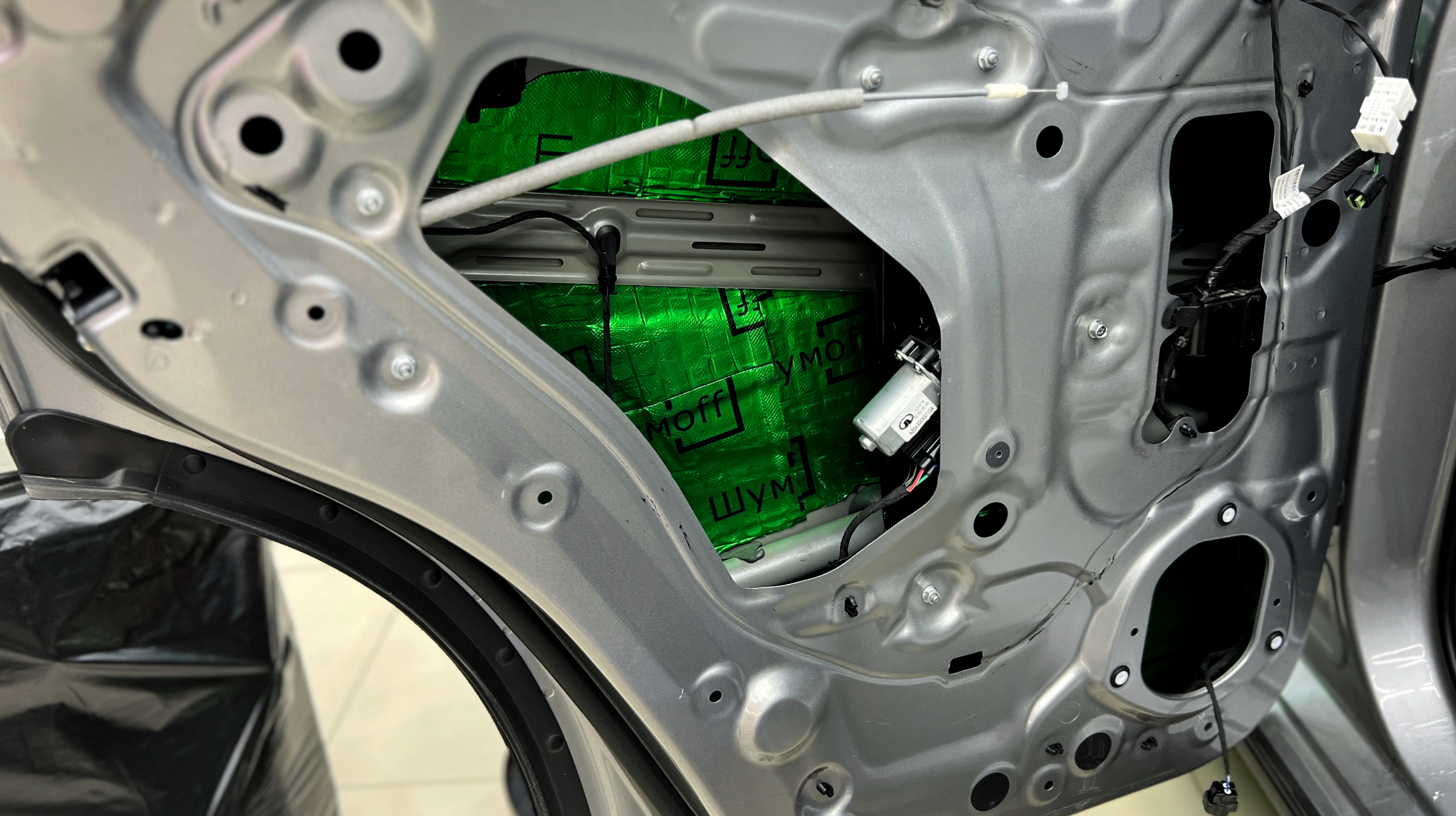 Вторым слоем на корпус панели как правило монтируется шумопоглотитель Absorber A15, однако в зависимости от конструктивных особенностей автомобиля, как и в данном случае, сделать это не всегда возможно, от чего наносится шумопоглотитель Герметон 7.