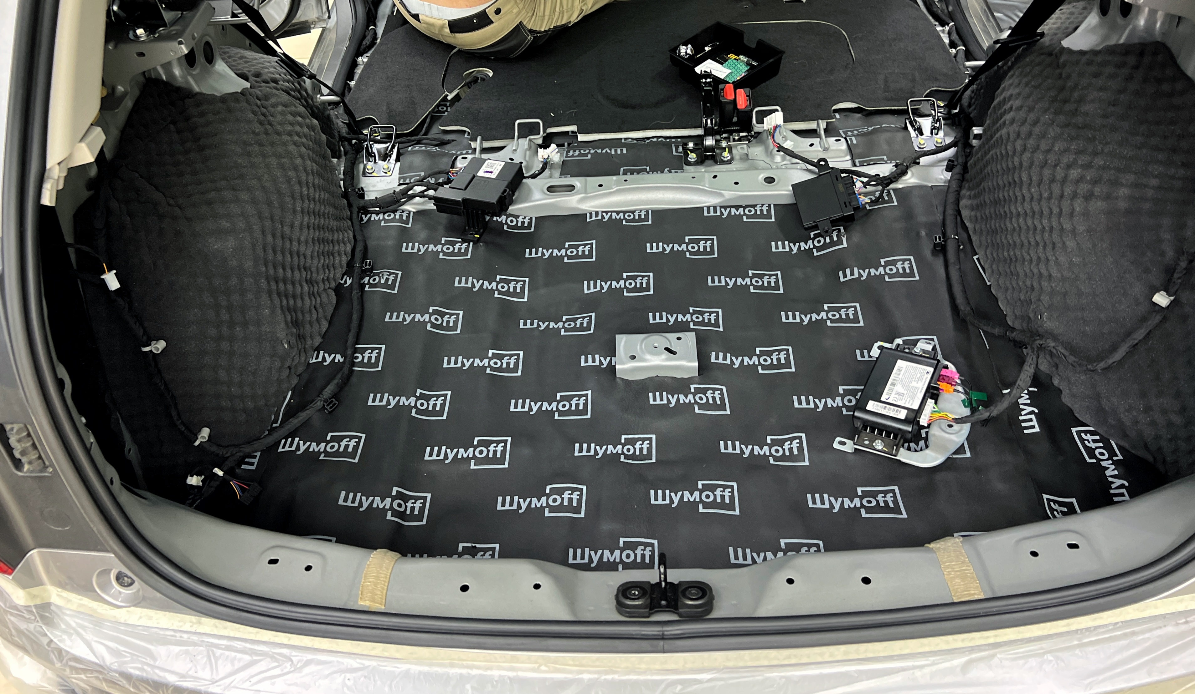 Обезжириваем поверхность и приступаем к монтажу второго слоя. Также для получения более эффективного результата используем компоновку из двух материалов На дно багажника клеим Шумофф Base 4. Этот слой позволит снизить нам шум от дороги.